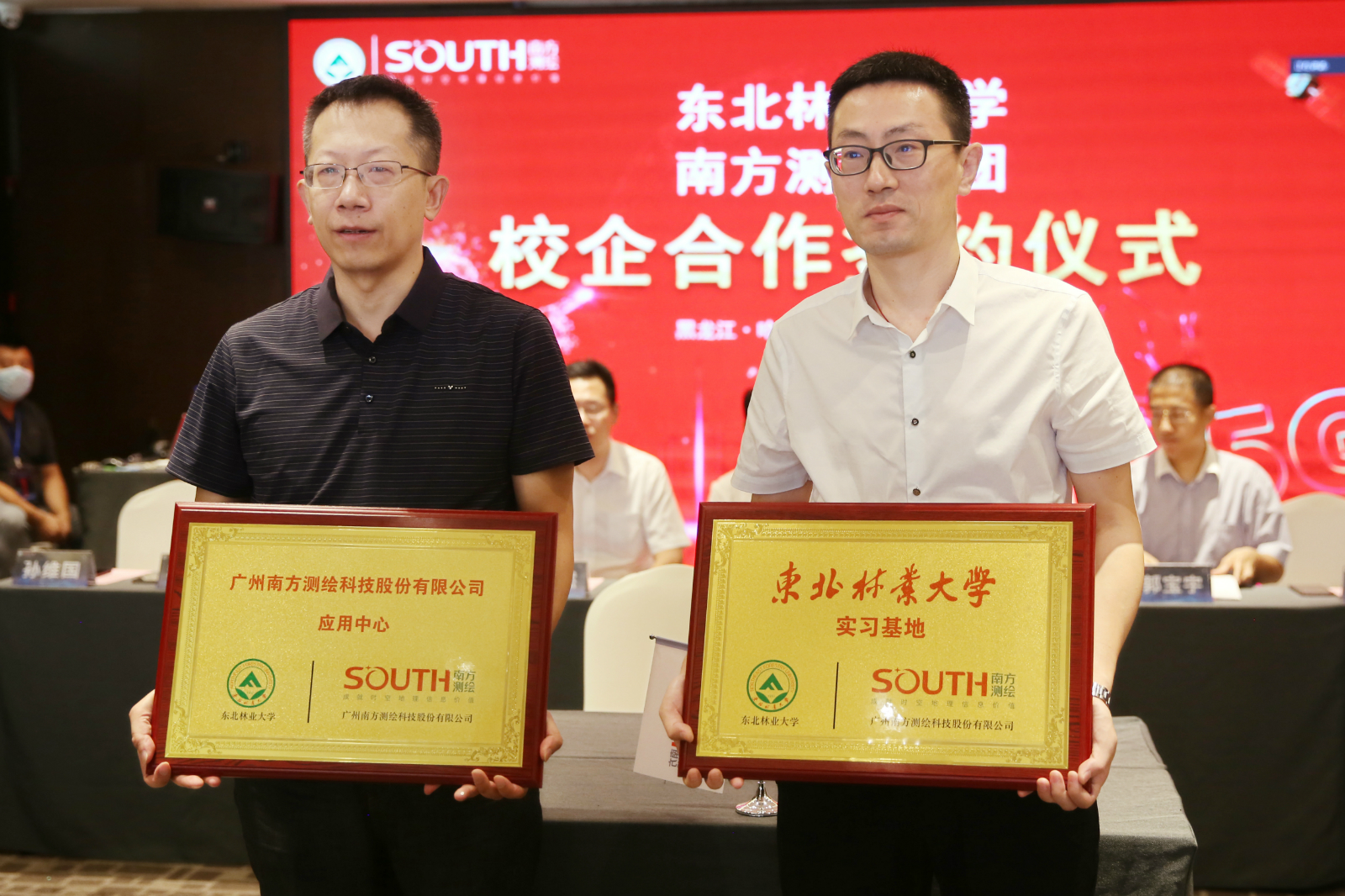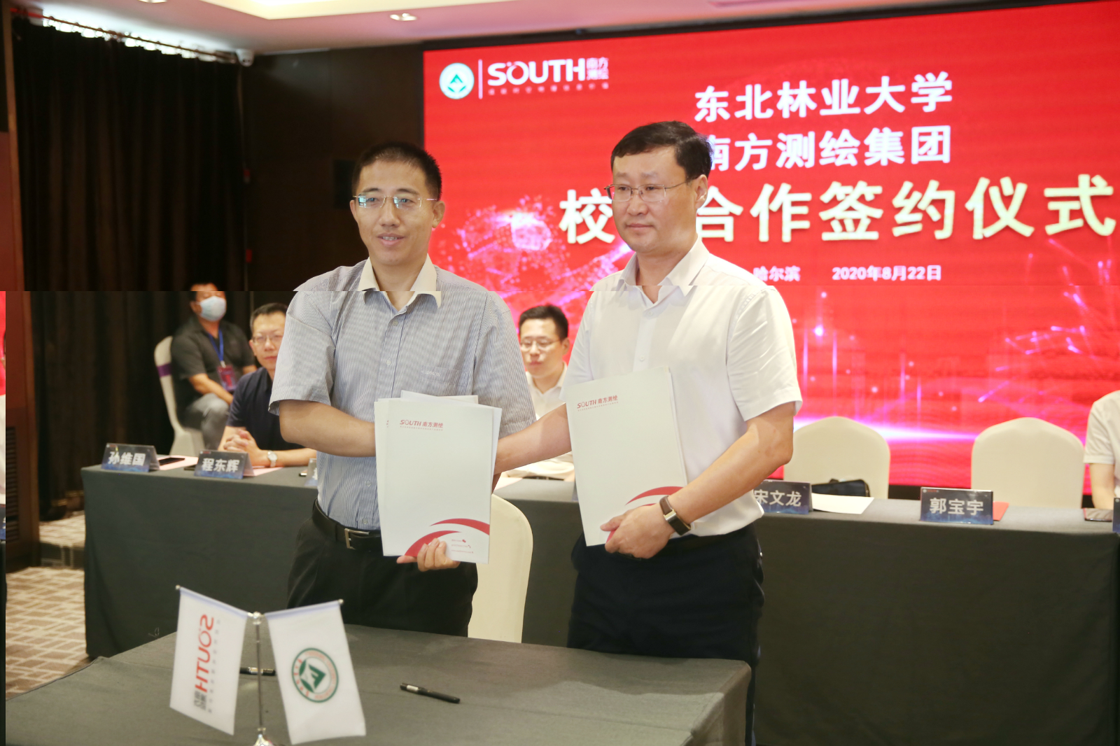 东北林业大学副校长宋文龙与南方测绘集团副总经理郭宝宇进行校企合作签约仪式。