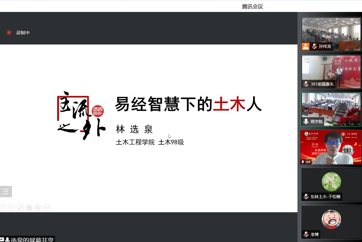 校友嘉宾们更是结合个人奋斗经历,为学弟学妹树立了榜样,颇为励志,并在学术研究和未来生涯规划方面提供了宝贵的建议。系列学术报告会增强了校友们与母校的情感联系,增进了校友们之间的交流互动与云端相聚,充分传承了“育土木人 塑土木魂 聚土木情 兴土木业”的土木精神。校友们深切地感受到了近年来学院、学校的高速发展,表达了对母校培育之恩的感谢,并送上了对母校70周年华诞的衷心祝福。