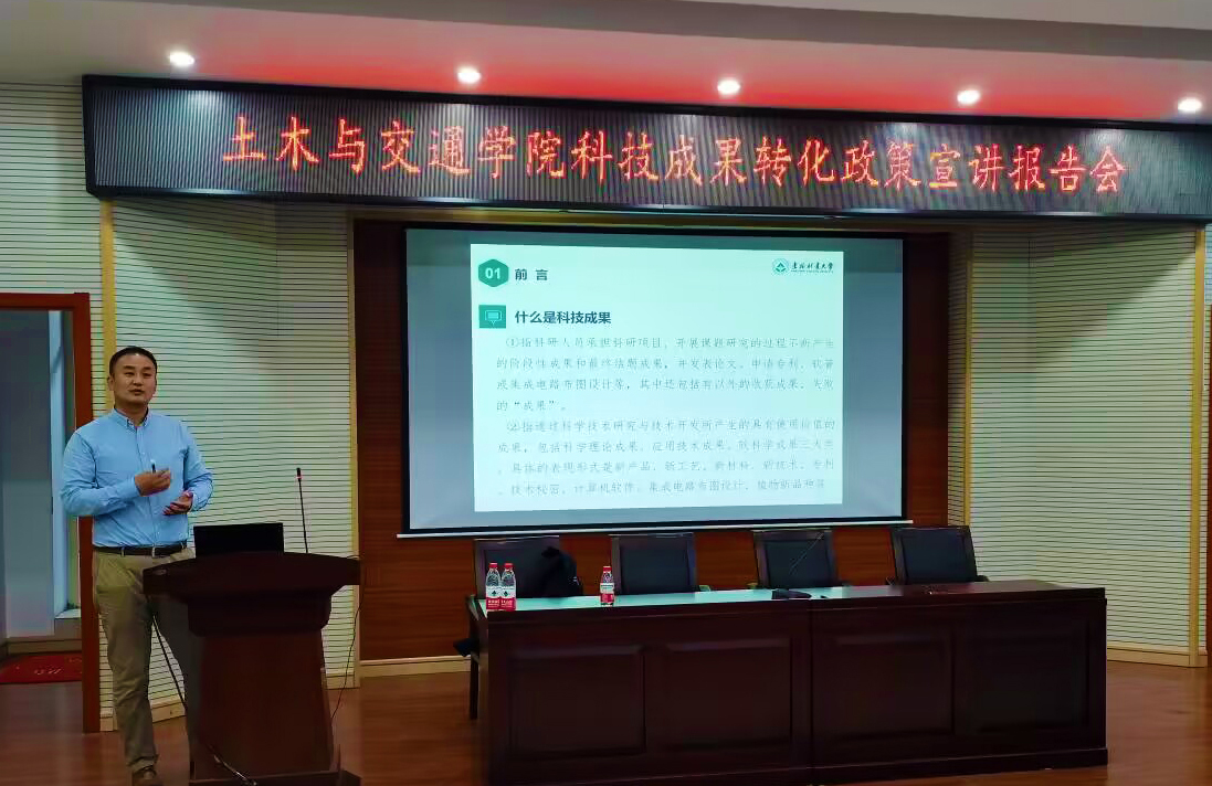 初冬虽大雪,科研正当时。为促进学校科技成果转化工作量质齐升,学校近年陆续出台了相关政策,鼓励学院教师和科研人员积极开展科技成果转化工作。11月8日下午15点40分,在土木与交通学院主东301学术报告厅,学院邀请校科学技术研究院姜洋副院长为学院教师作科技成果转化相关政策的详细解读,让老师们更好地了解了最新政策。报告会由王立峰副院长主持,学院近50名教师参加了宣讲报告会。