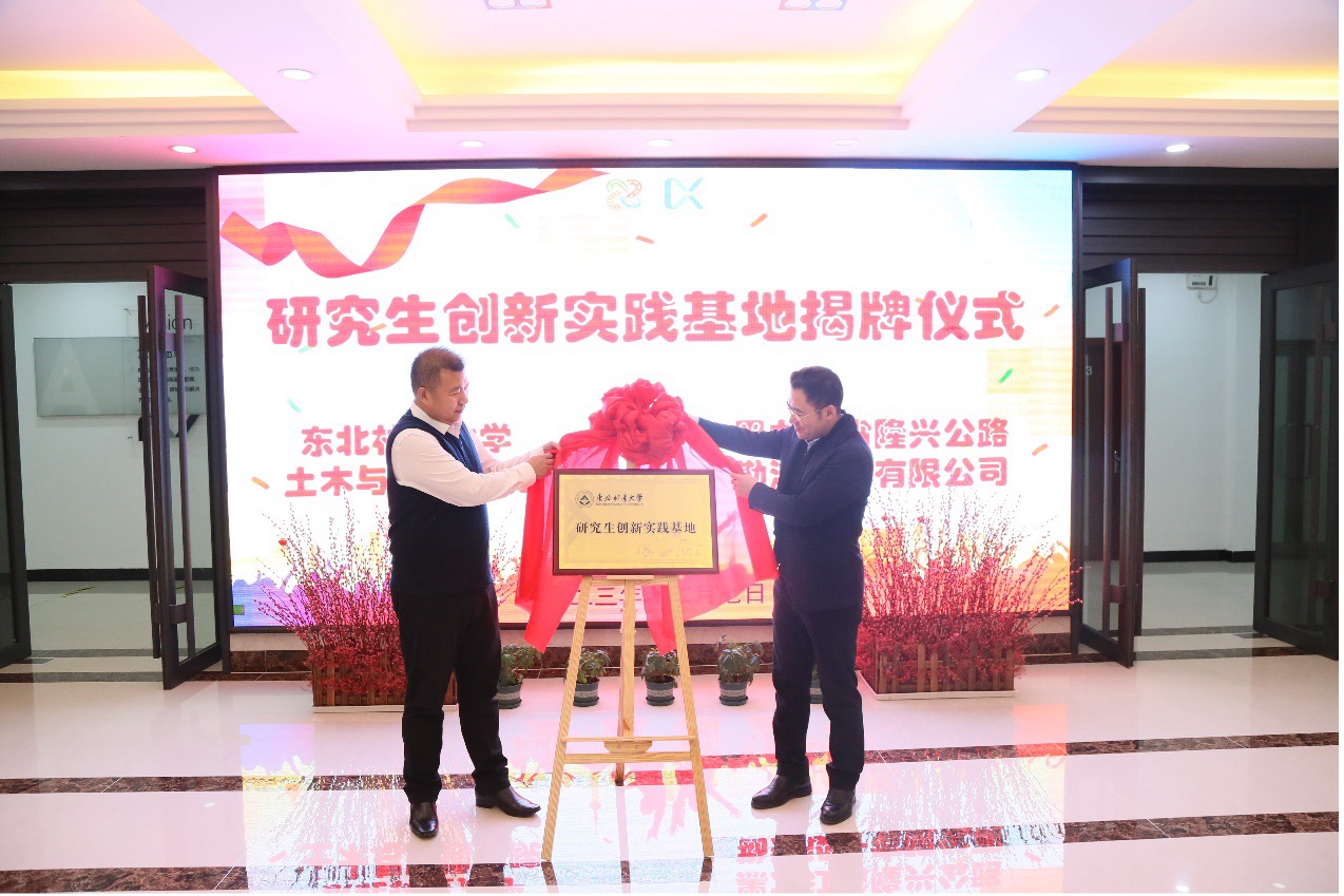 交流会后,隆兴公路勘察设计有限公司董事长王佳昌及企业代表和东北林业大学土木与交通学院党委书记李洪峰及学院相关领导至公司一楼进行了研究生创新实践基地揭牌仪式。至此,我院在隆兴公路勘察设计有限公司的实践基地正式落成。此举深化了双方的合作纽带,进一步推动了校企资源优势互补,对我院研究生就业与实践培养具有重要的意义。