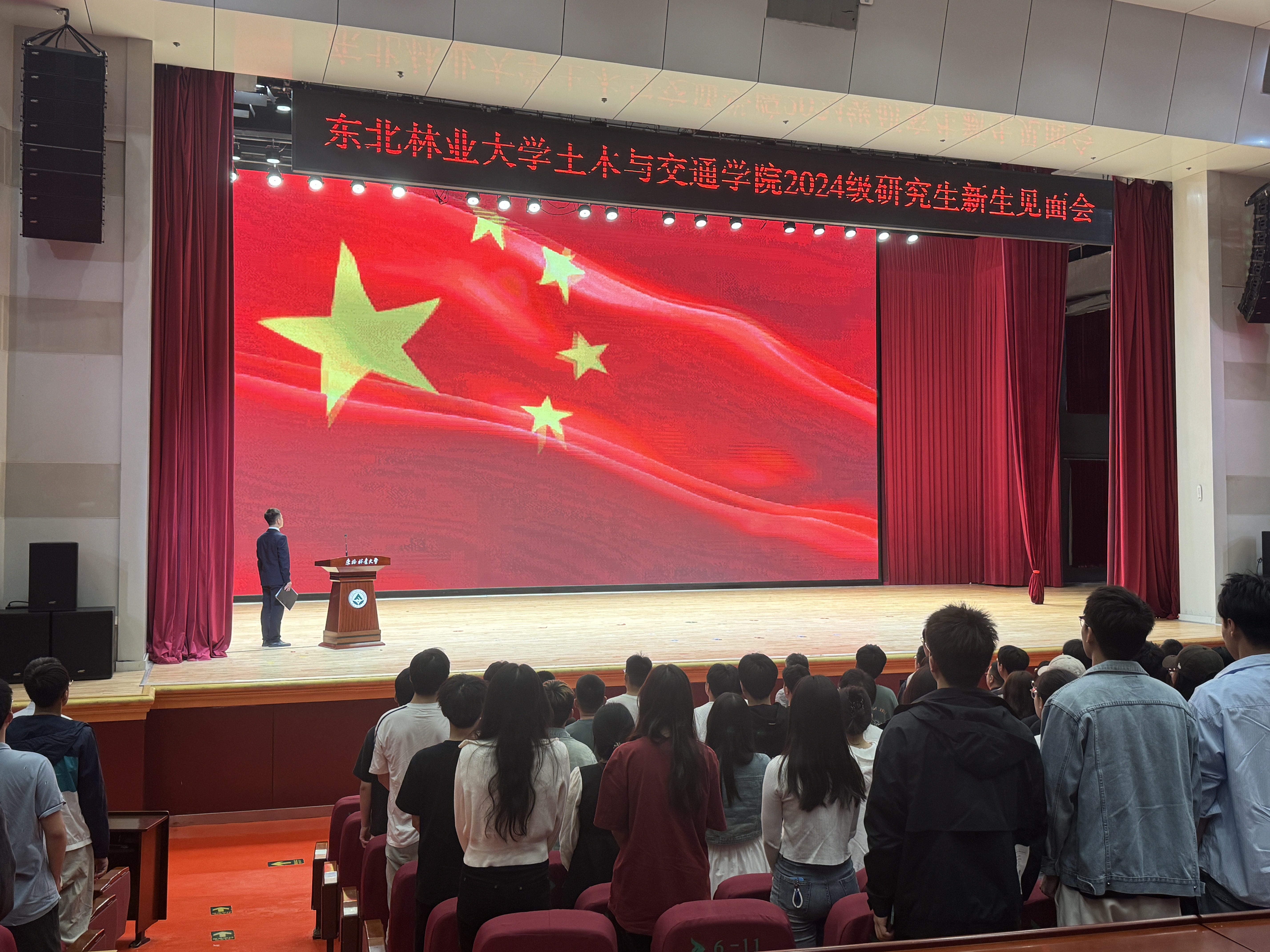 全体师生面向五星红旗,奏唱国歌,以铿锵有力的歌声拉开2024级研究生新生见面会的序幕。