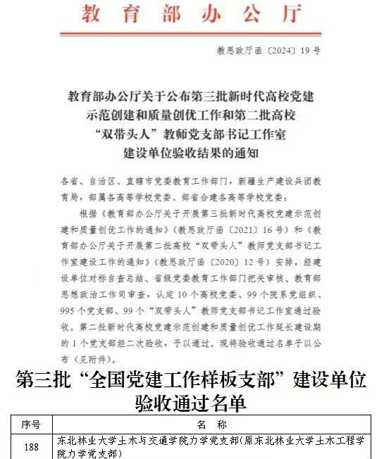 近日,教育部公布了第三批新时代高校党建示范创建和质量创优工作及第二批高校“双带头人”教师党支部书记工作室建设单位验收通过名单,我校土木与交通学院力学党支部通过验收。