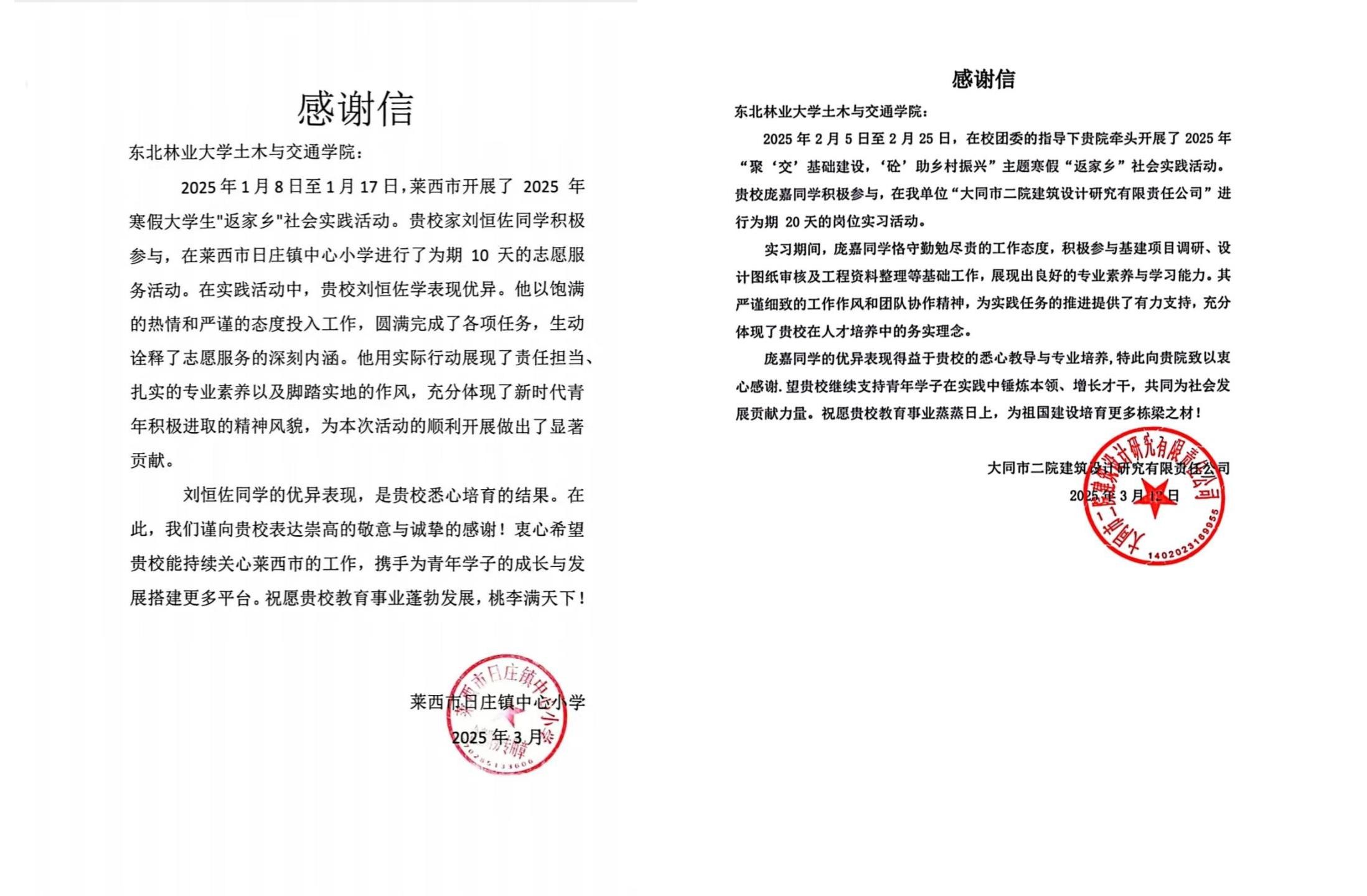 近日,随着2025年寒假大学生“返家乡”社会实践活动逐渐落下帷幕,我院陆续收到多封来自全国各地基层单位的“感谢信”!思政小课堂,社会大舞台,这些“温情回执”的背后,是我院广大学子实践成果和家乡发展需求的“双向奔赴”。