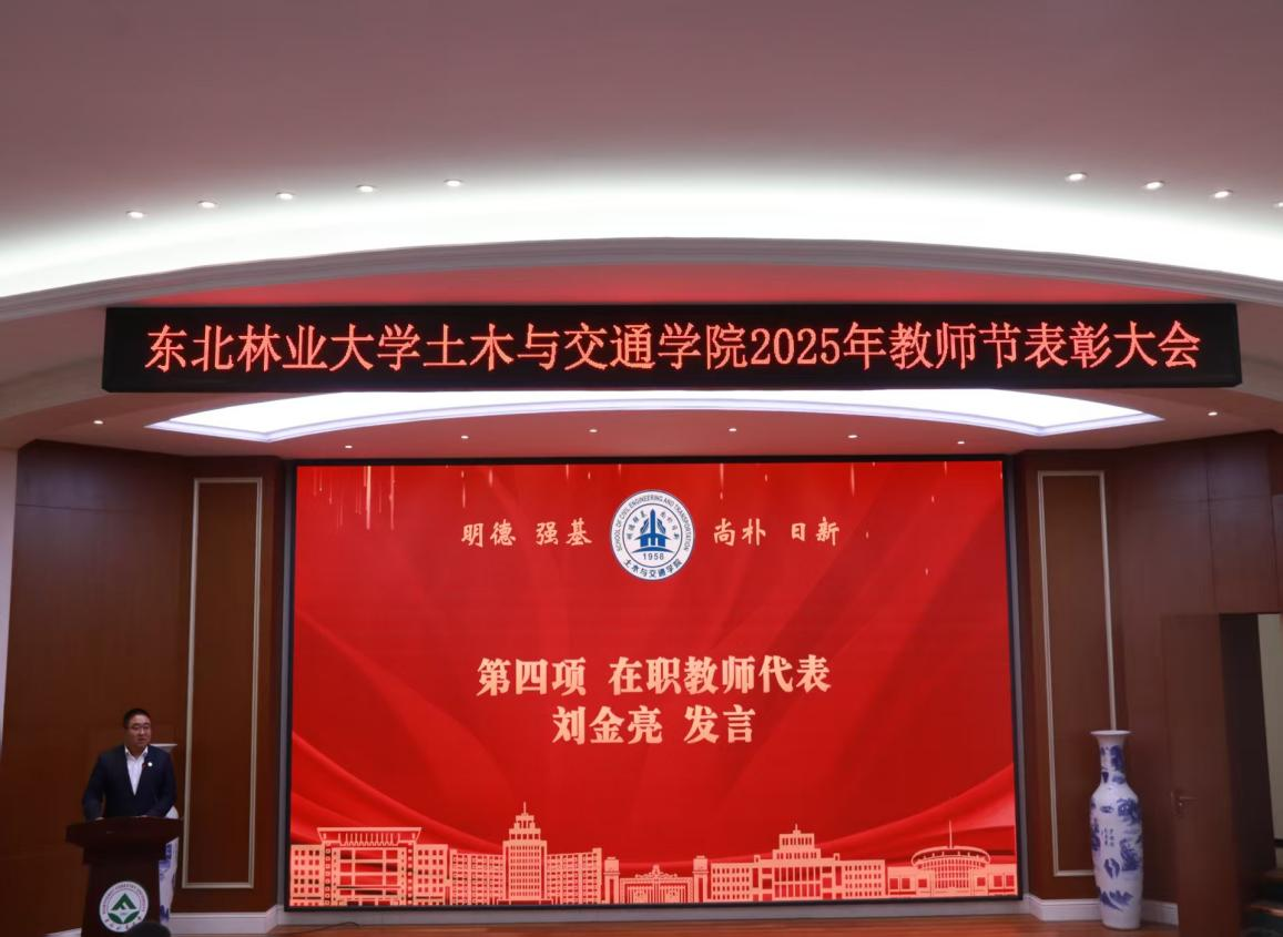 在职教师代表刘金亮分享从教感悟,作为土木交通领域的教育工作者肩负重大责任,并高度赞扬学院所有教师的奉献精神,为学生们在各类学术竞赛和国家建设中取得的卓越成就感到自豪,承诺将继续深化教学改革,培养适应未来的创新型人才,为谱写学院新篇章贡献力量。