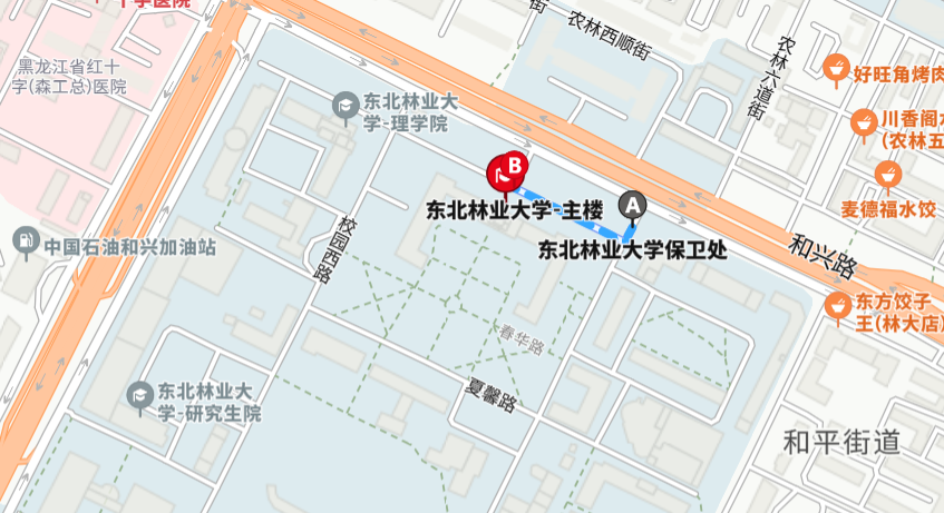 (A点为东北林业大学2号门入口,B点为考试场地)