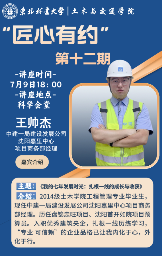 为助力同学们深入了解职场生态,激发同学们探索职业可能性的内在动力和意识,树立同学们主动规划未来的积极态度,同时促进理论与实践的深度融合,土木与交通学院特邀哈尔滨市南岗区交通运输和站前管理局李尔达和中建一局建设发展公司沈阳嘉里中心项目商务部经理王帅杰,为同学们带来“匠心有约”第十二期专题讲座。此次讲座旨在通过两位嘉宾丰富的职场经验,为同学们点亮职业发展的灯塔,拨开人生职业规划的迷雾,指引大家迈向理想职业的征途。