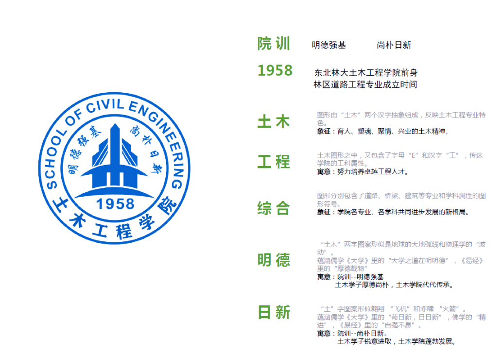 明德:《大学》曰“大学之道,在明明德”,在此引申为树立高尚的道德情操。立德树人,以德为先,土木人才,立德铸魂,故明德第一。
